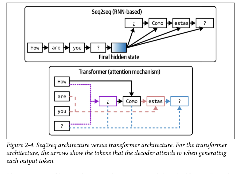 use RNNs as its encoder and decoder: the encoder processes the input tokens sequentially, outputting the final hidden state that represents the input. The decoder then generates output tokens sequentially, conditioned on both the final hidden state of the input and the previously generated token