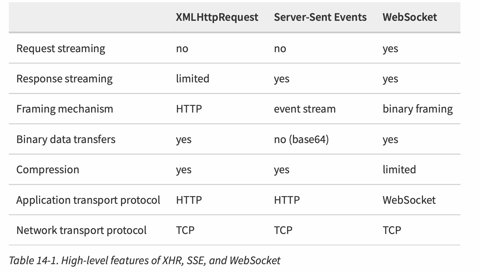 - Some protocols may offer low-latency delivery (e.g., Server-Sent Events, WebSocket), but may not meet other critical criteria, such as the ability to leverage the browser cache or support efficient binary transfers in all cases.