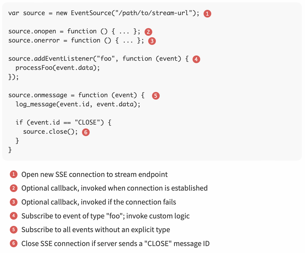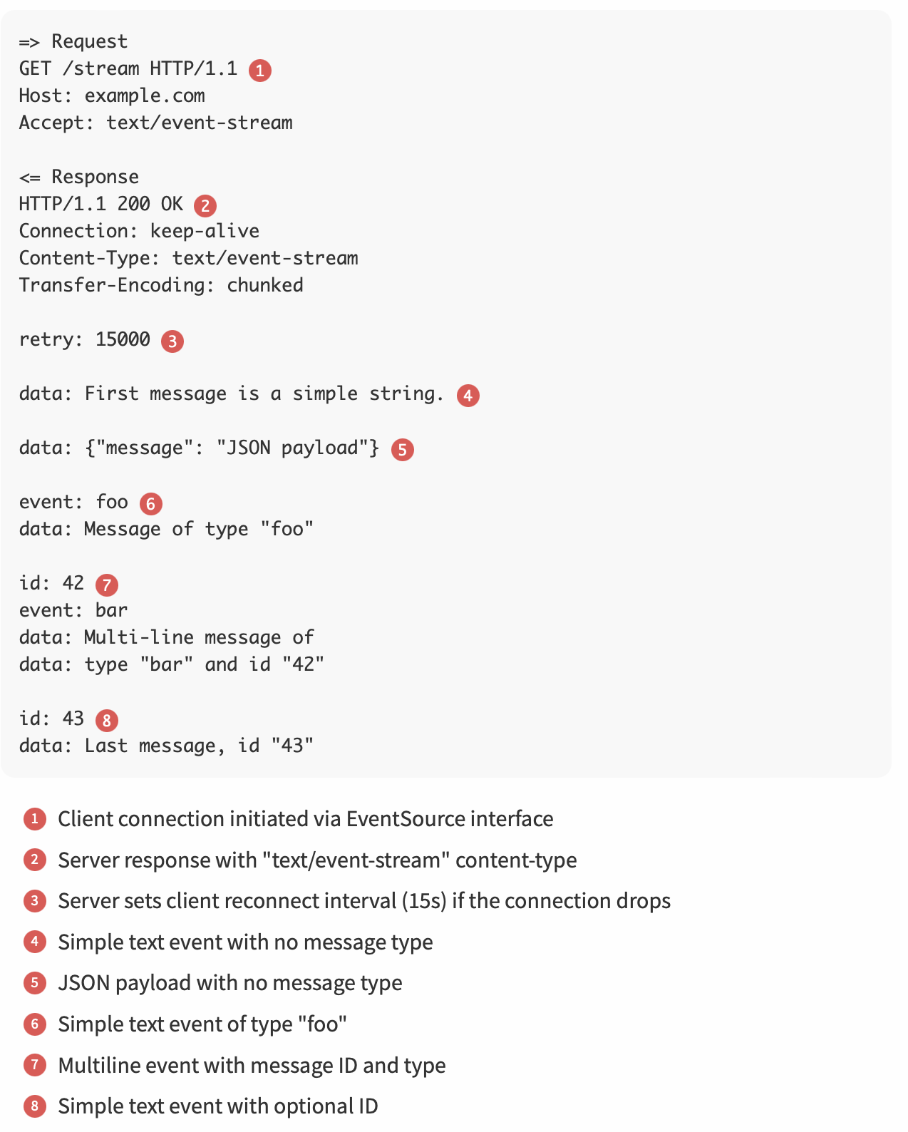 - EventSource interface also provides auto-reconnect and tracking of the last seen message: if the connection is dropped, EventSource will automatically reconnect to the server and optionally advertise the ID of the last seen message, such that the stream can be resumed and lost messages can be retransmitted.