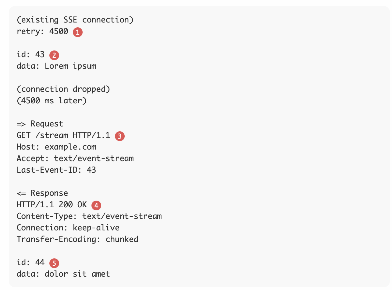 retrycommand to the client. Similarly, the server can also associate an arbitrary ID string with each message. The browser automatically remembers the last seen ID and will automatically append a “Last-Event-ID” HTTP header with the remembered value when issuing a reconnect request.