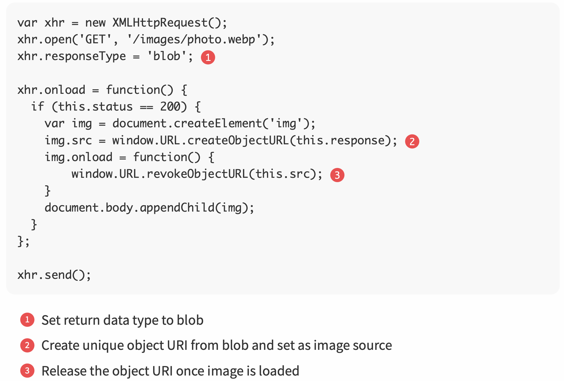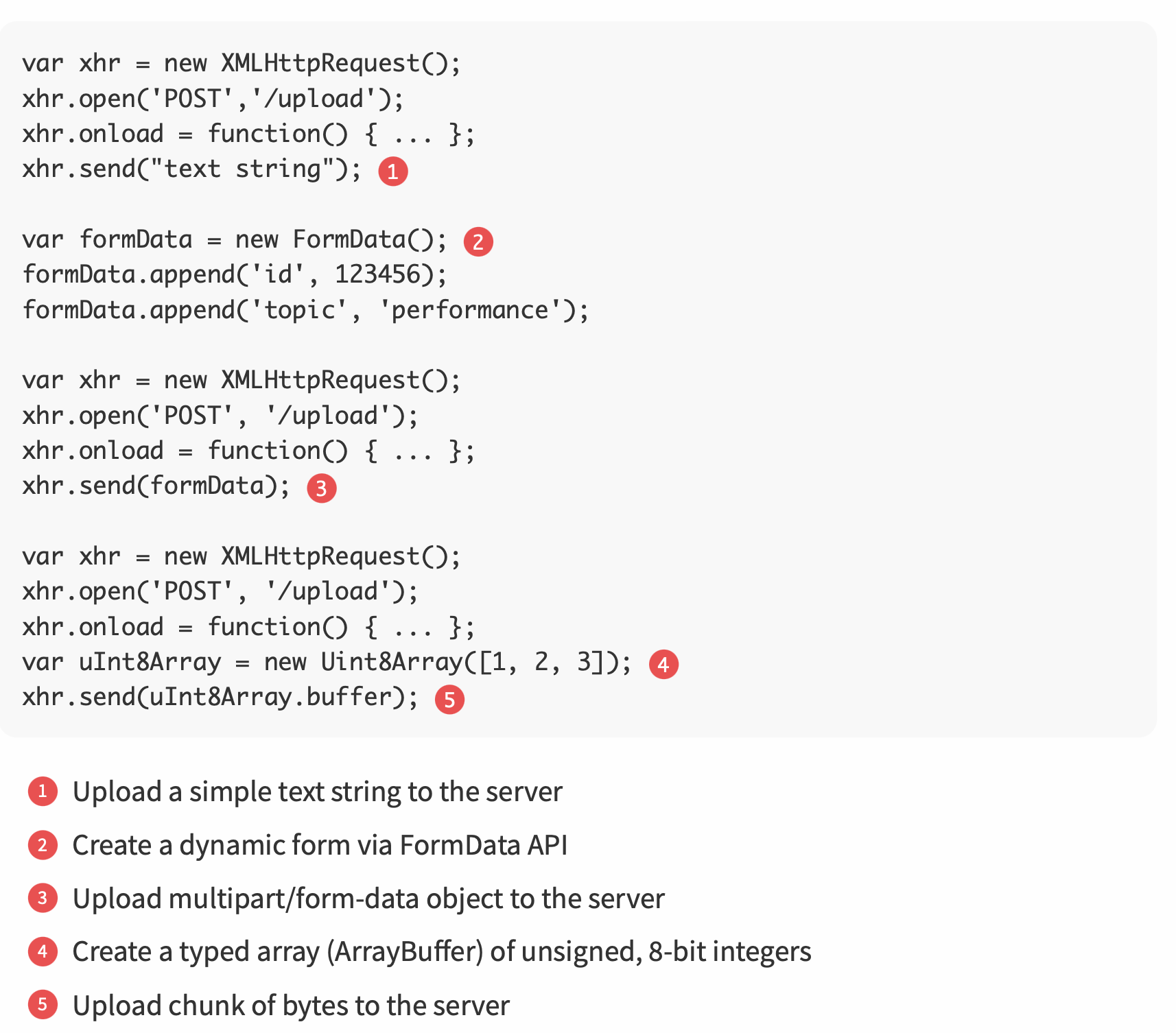 DOMString,Document,FormData,Blob,File, orArrayBufferobjects, automatically performs the appropriate encoding, sets the appropriate HTTP content-type, and dispatches the request. - send a binary blob or upload a file provided by the user: grab a reference to the object and pass it to XHR. can also split a large file into smaller chunks