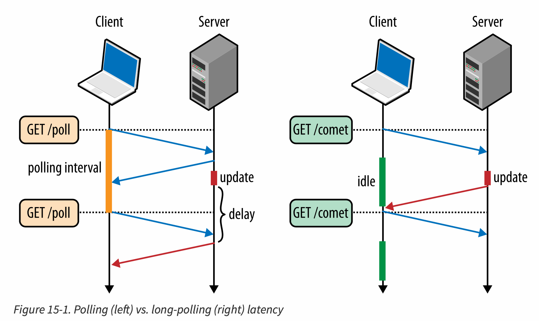 - server holds the connection open until an update is available — Comet