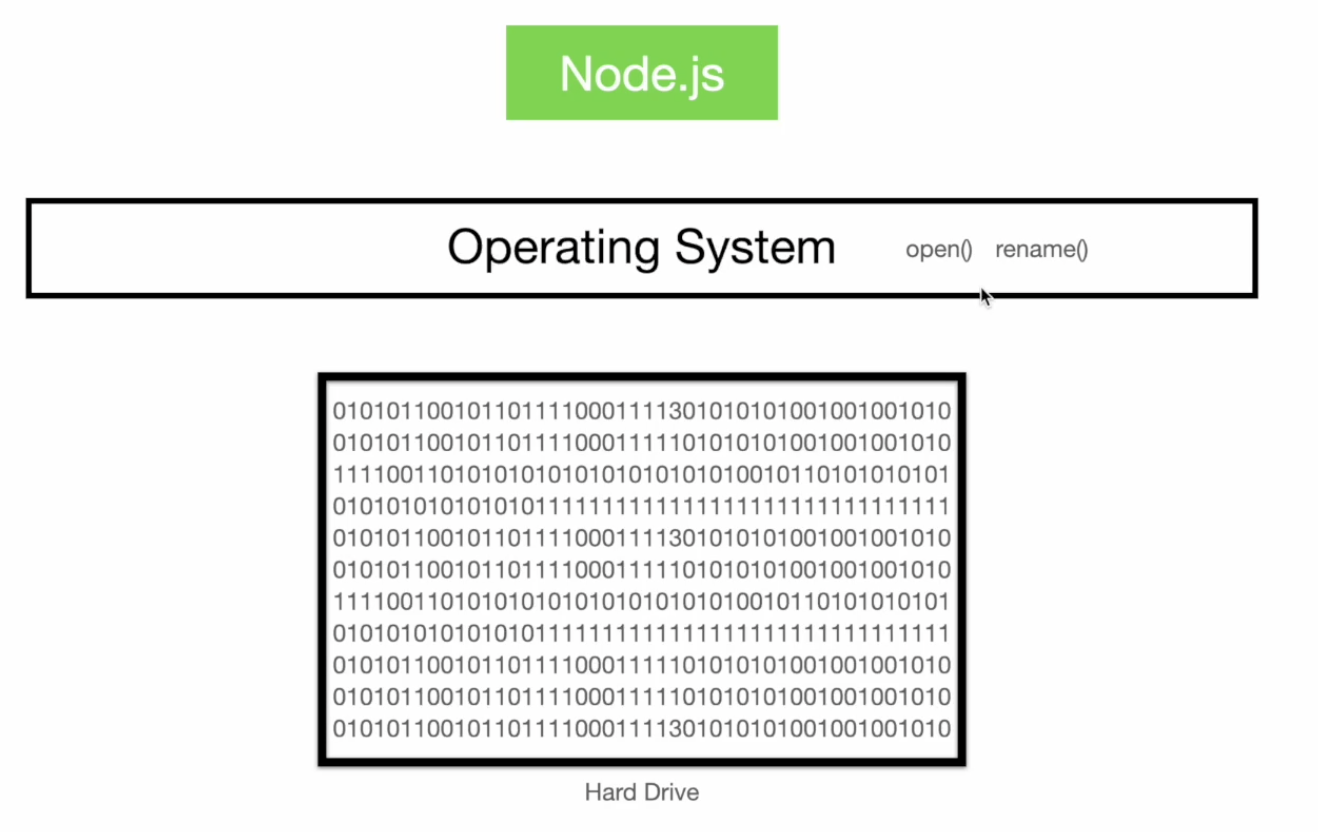 - Nodejs 通过 system calls(talking to the operating system) 来和 hard drive 交互