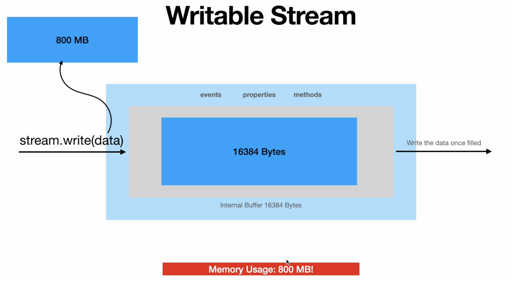- writable stream: 如果一次性写入 write 的数据超过了 stream 的 size,或者一直在写入,又没有清空的话,就会把剩余的内容 keep 在 memory 中 (backpressure)
