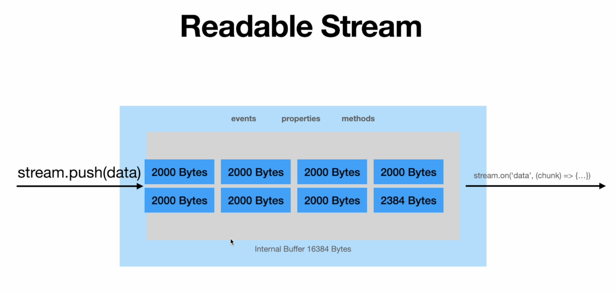 - readable streams: once the internal buffer is full we’re going to get an event called data.