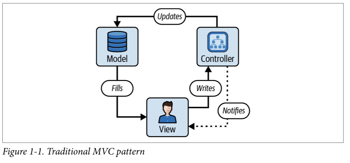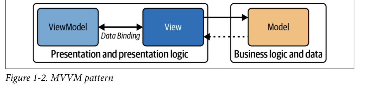 (React further improves on MVVM with its unidirectional data flow by geting even narrower in terms of data ownership, such that state is owned by specific components that need them.) - MVVM pattern: an evolution of the traditional Model-View-Controller (MVC) pattern, tailored for modern UI development platforms where data binding is a prominent feature